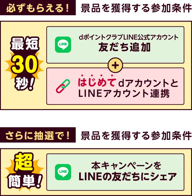 本キャンペーンは応募期間中、「dポイントクラブ」LINE公式アカウントを友だち追加し、dアカウントとアカウント連携を行うと後日dポイント100ptが必ずもらえます※1。さらにWチャンスで本キャンペーンをLINEの友だちにシェアすると抽選で30,000名様にdポイント100ptが当たります。